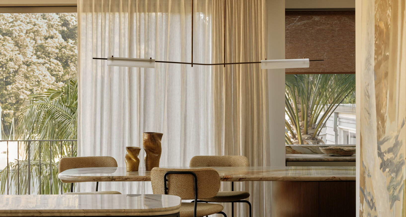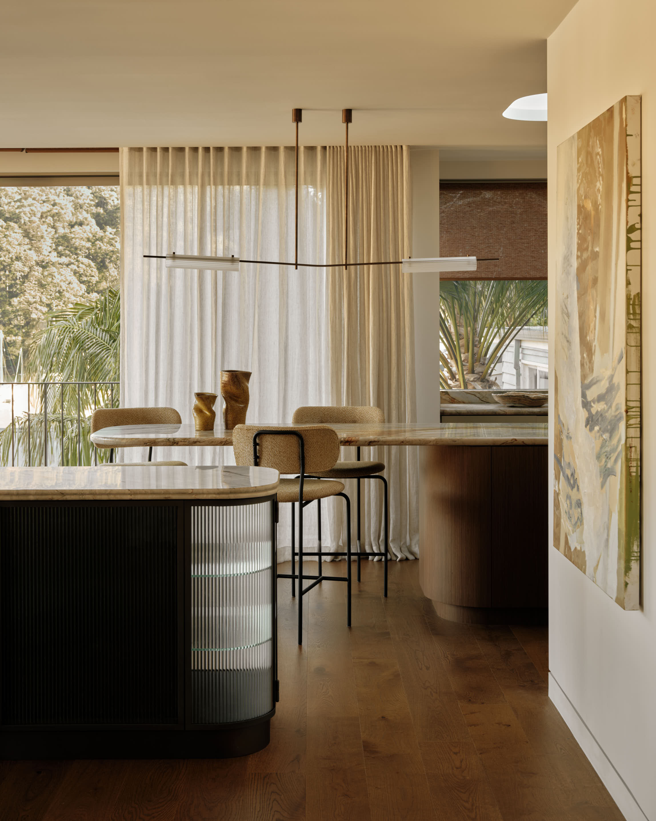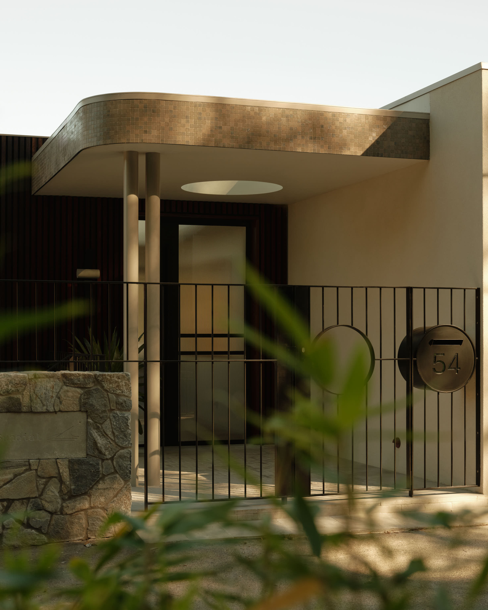 Originally a 1960s apartment block, the house has been reimagined with sculpted voids, re-planned rooms, and a palette inspired by sandstone, eucalyptus, and coastal dusk.