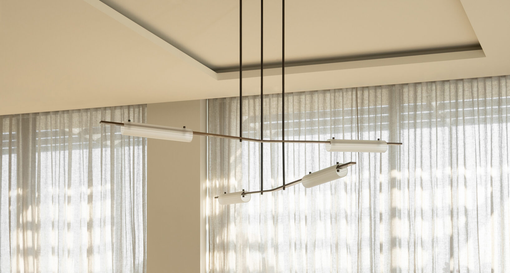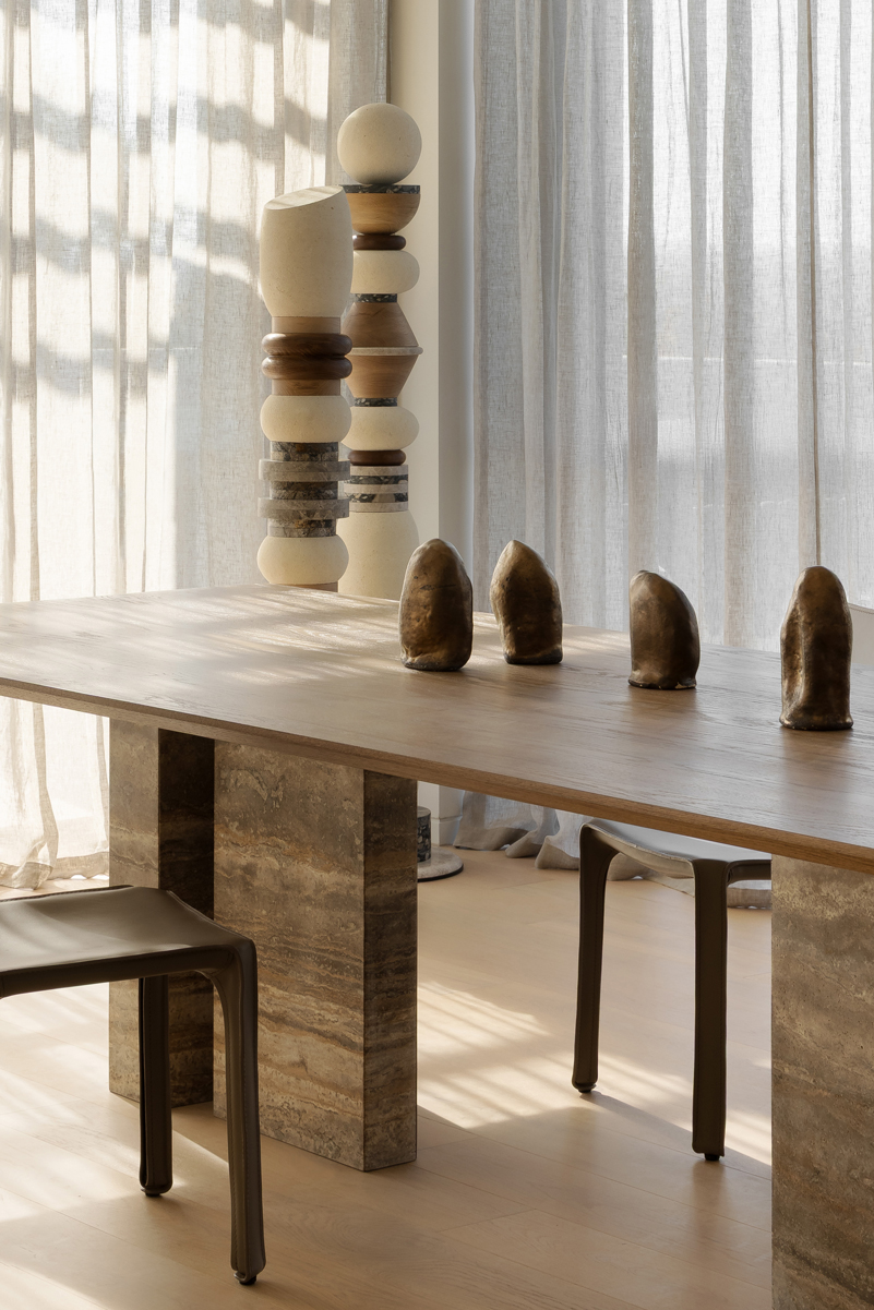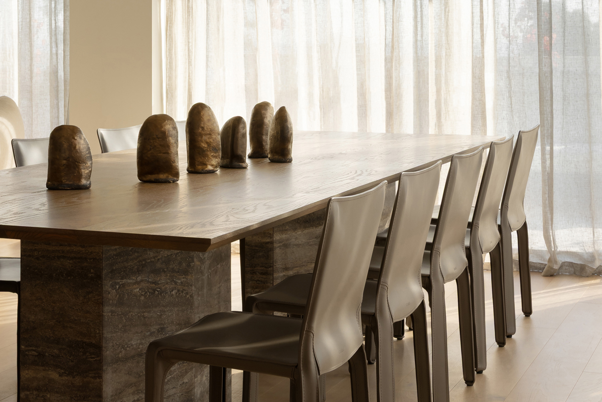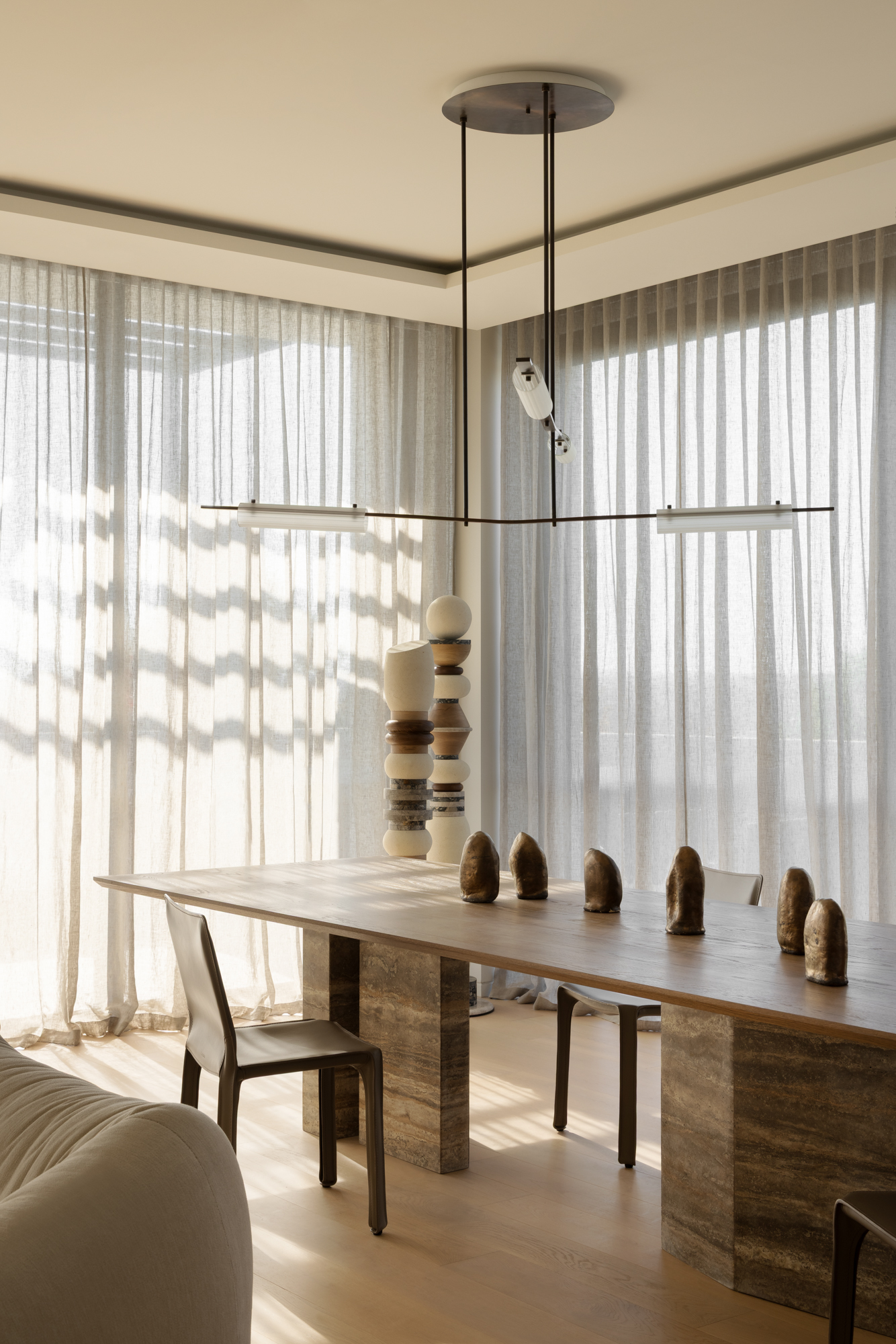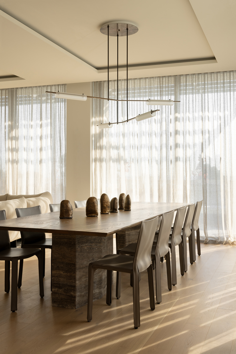 Curated by Homeroom Studio with architecture and interior design by Paul Conrad Architects, this dining space celebrates balance and refined materiality. The Volant Chandelier anchors the room, its linear form echoing the architectural rhythm while casting a soft, diffused glow over the timber travertine table below. The result is a calm and inviting setting where natural textures and sculptural forms come together in quiet harmony.