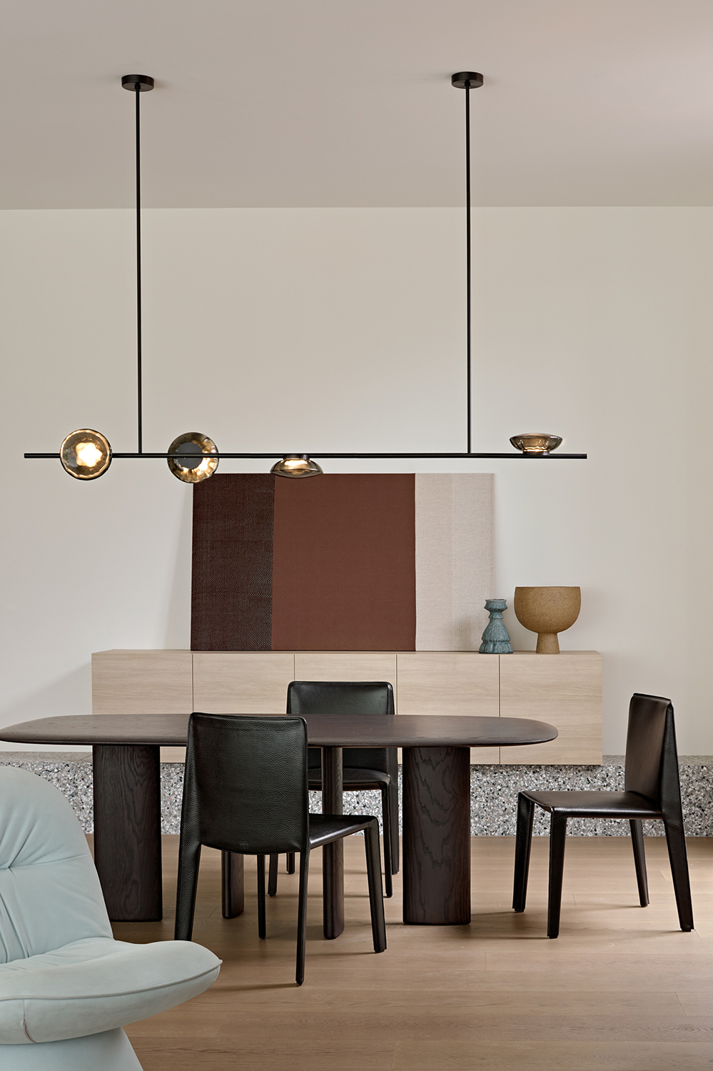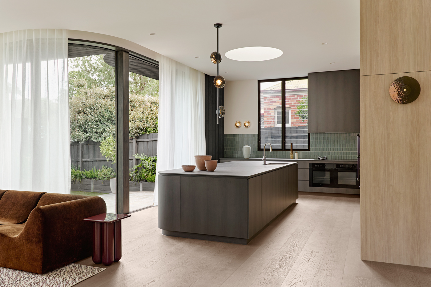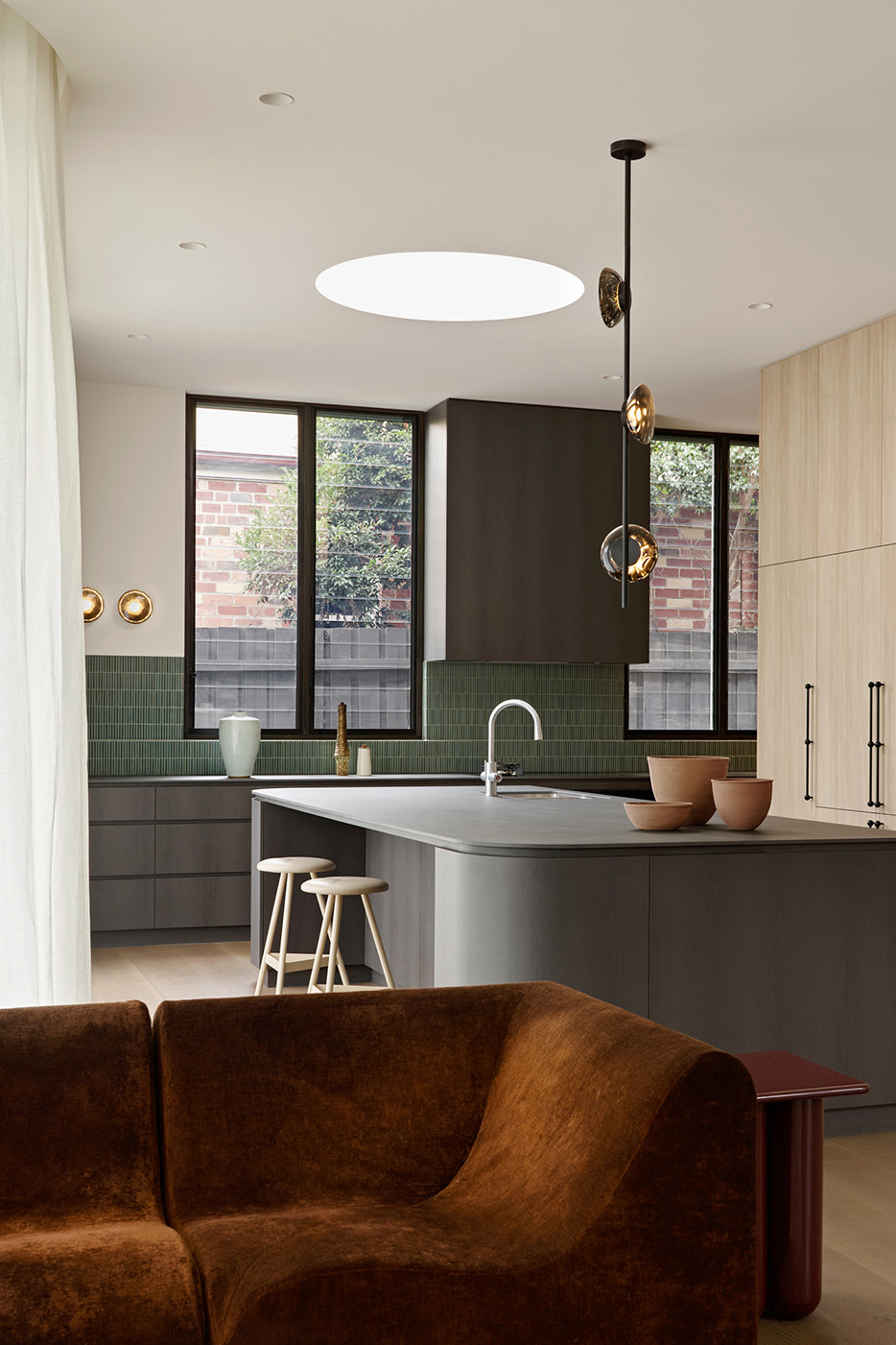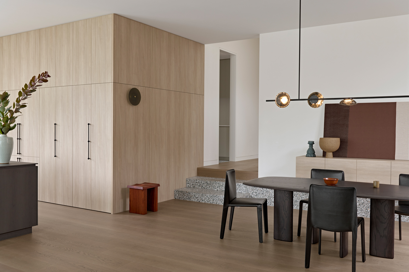 At the heart of Studio Cobe’s Orrong project, the kitchen and dining spaces form a calm, light-filled centrepiece. Stepping down with the natural fall of the site, these areas are anchored by terrazzo that rises behind the dining zone to create a sculptural plinth for a timber sideboard.