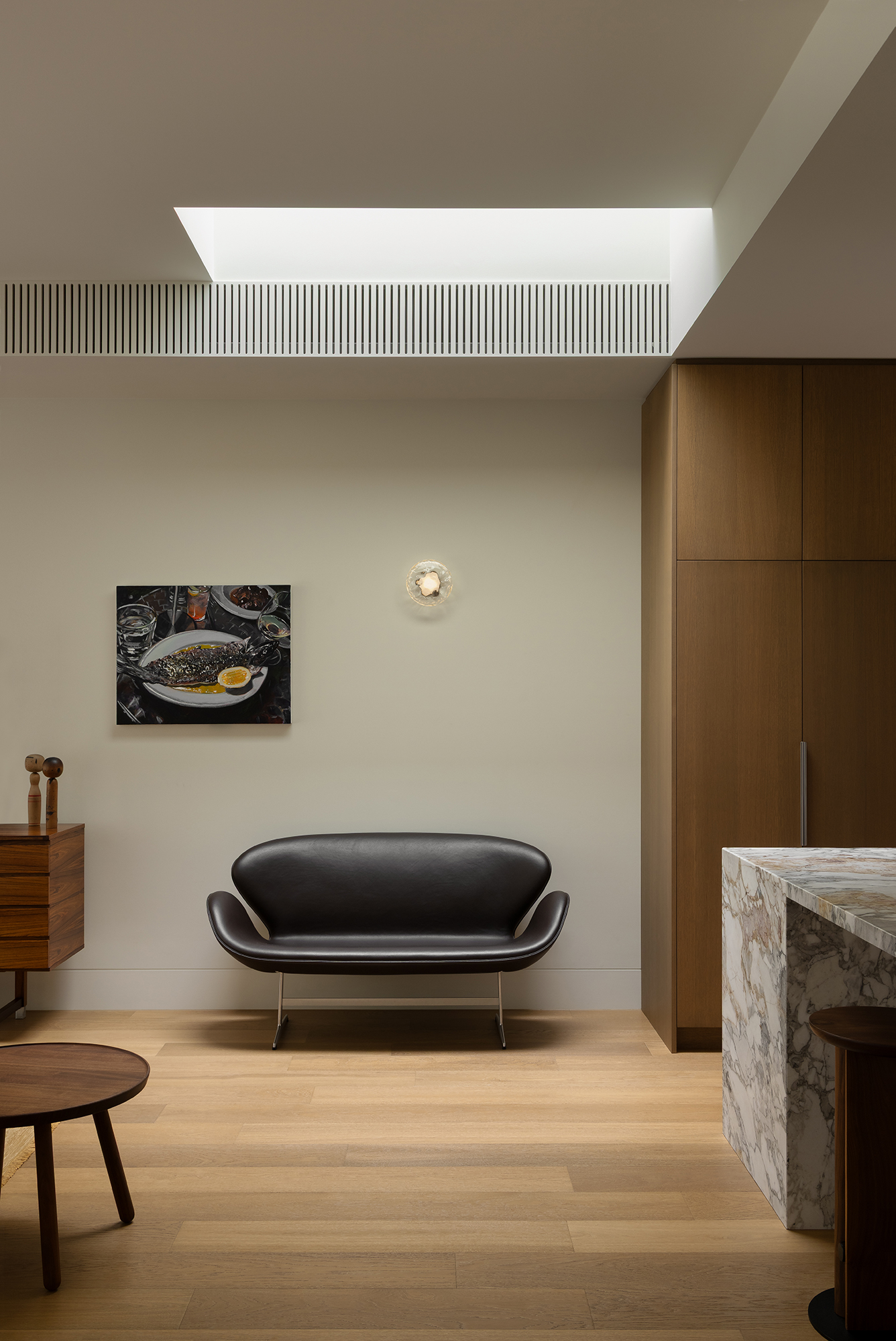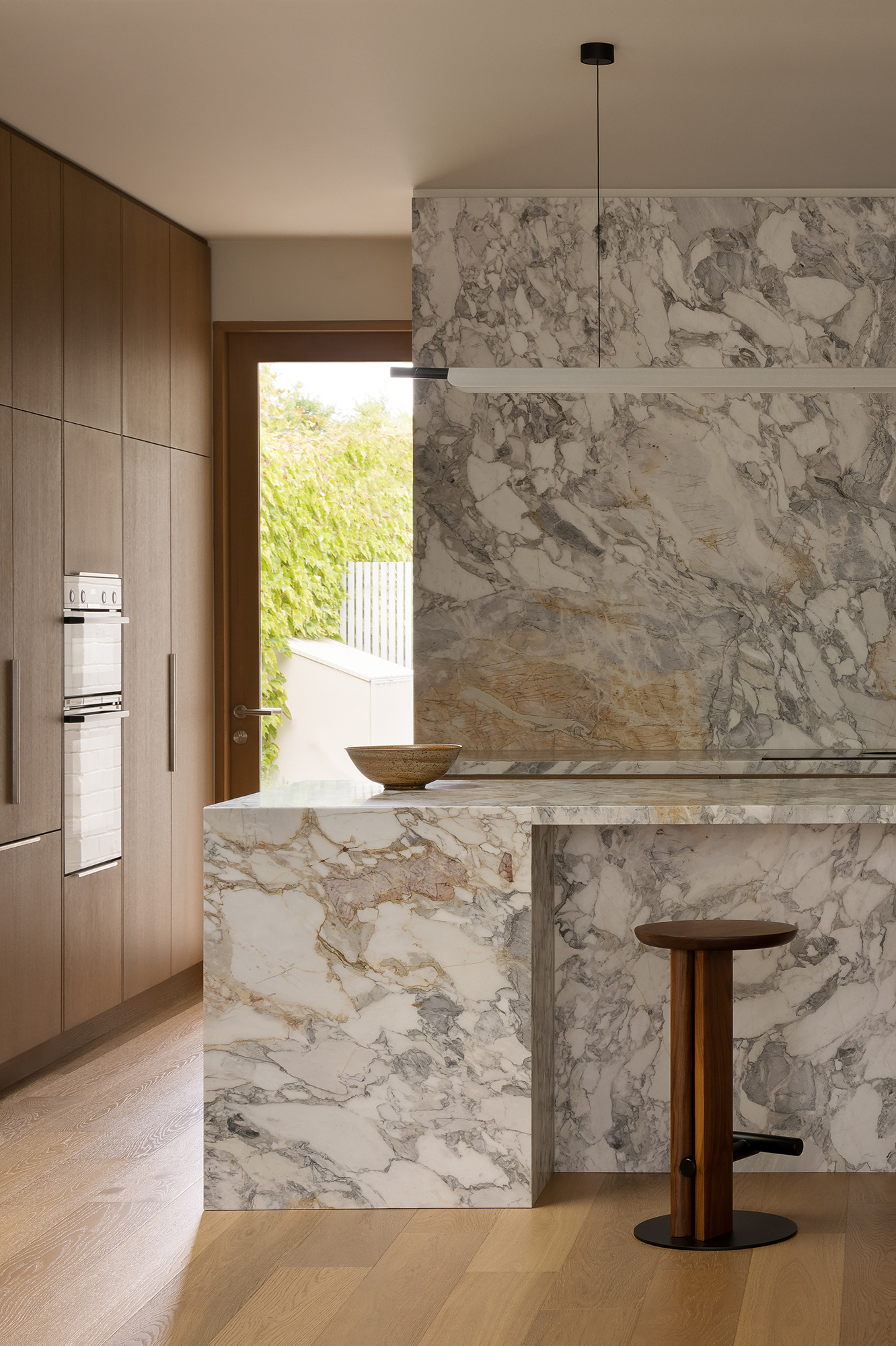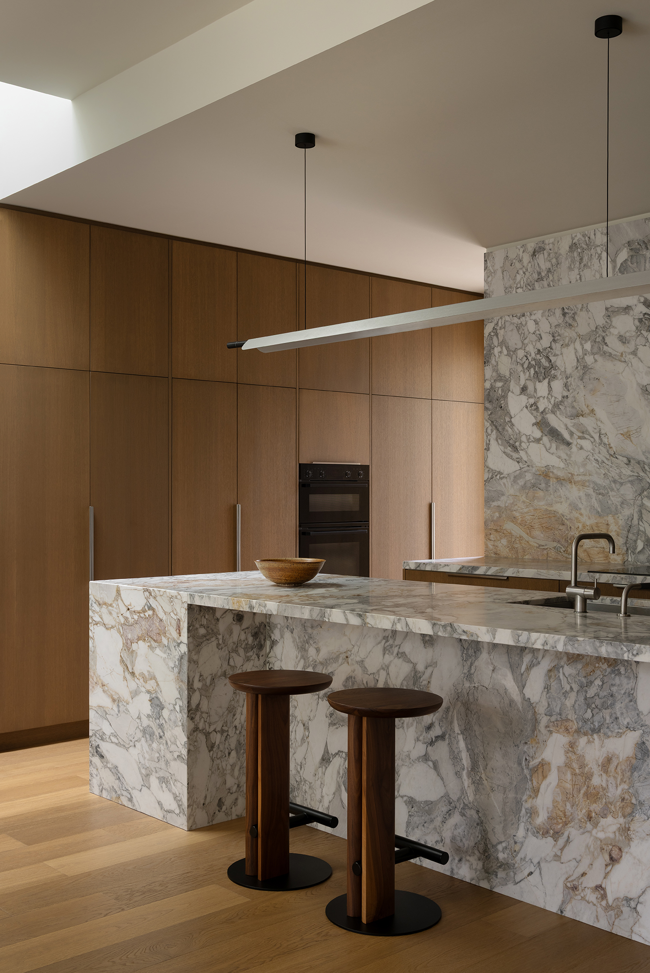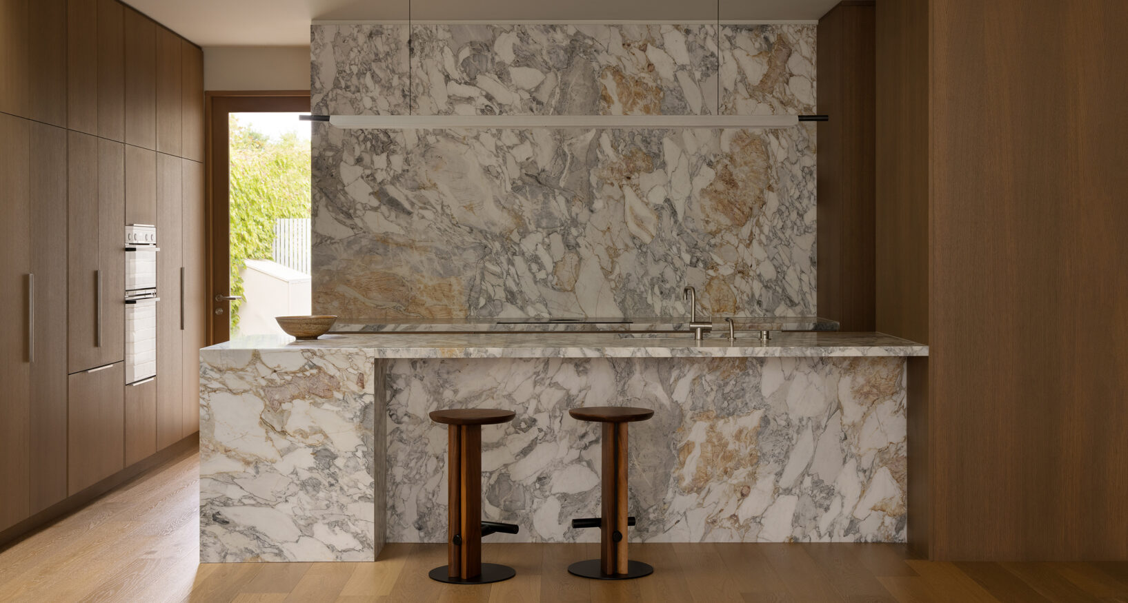 The kitchen, dining and lounge are conceived as one open, connected space, designed to feel both grounded and inviting. A layered mix of natural materials creates a moody, cohesive palette, where warm timbers, stone and subtle metallic finishes bring depth and softness. At the island, sculptural timber stools introduce a sense of craftsmanship and tactility, anchoring the space with a quiet, functional presence.